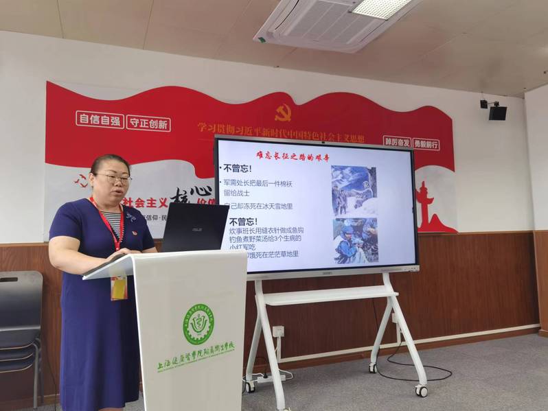 首先进行第一议题学习:弘扬以伟大建党精神为源头的中国共产党人精神谱系学习。由英语教研室刘娜老师以长征精神为主题,分享长征精神的学习体会。刘娜结合习近平总书记在纪念红军长征胜利80周年大会上的讲话精神,阐述了长征精神的本质内涵,从“自己为什么选择长征精神分享”切入,结合爷爷曾经亲身参加长征的经历娓娓道来,挖掘和讲述了自己在家庭熏陶中感受革命文化接受红色洗礼的相关经历和故事,并从“长征的历史背景、长征过程中的主要事件、长征精神的影响、长征精神的传承与发展”几个方面,对长征精神的历史形成、当代价值和深远影响、未来传承与发展深刻谈了自己的认识,其中既有对过去革命英雄和先烈们的历史回顾与故事讲述,也引入了当前教育领域的热点问题和当代青年应该承担的责任担当,引领党员对长征精神与当下时代、与自身工作使命的关系及思考形成了新的认知。