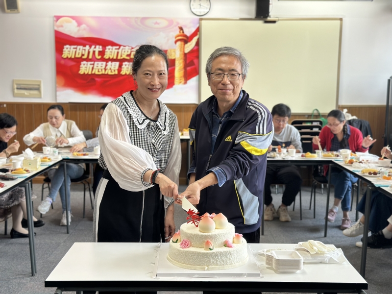 秦建晔和高峰作为新一轮退休教师代表为大家切开寿桃蛋糕,象征着团圆与祝福,大家共同祝愿学校的未来更加美好。