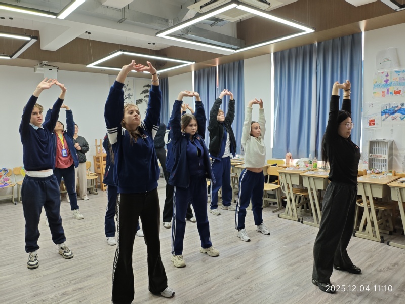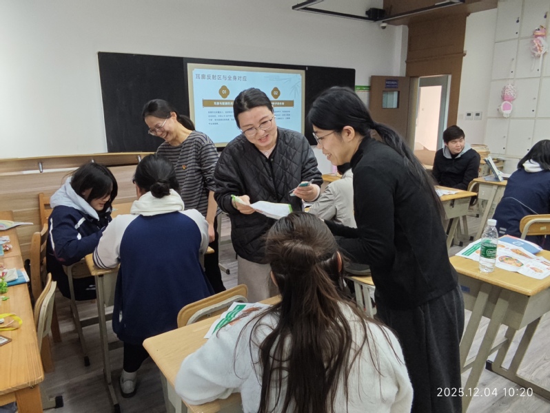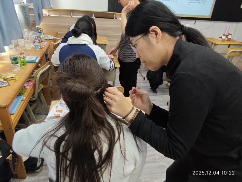活动现场,志愿者们通过生动的讲解与示范,依次介绍了耳穴埋籽、艾灸、八段锦三项中医传统疗法。在耳穴埋籽环节,教师们引导学生亲手将王不留行籽贴于耳部相应穴位,感受这一古老疗法的独特魅力;艾灸体验中,学生们在教师指导下学习温灸手法,体会传统灸法的温通之效。活动尾声,全体参与者共同练习中医导引术八段锦,中外师生跟随节奏舒展肢体,感受传统养生功法的韵律与内涵。整套动作流畅自然,既展现了中医文化的深厚底蕴,也体现了中外文化交流的和谐氛围。
