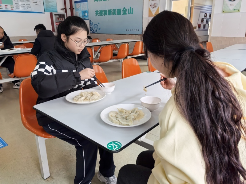 随后,陈荣凤校长也加入到包饺子的队伍中,她手法格外娴熟,取皮、填馅、捏褶的动作一气呵成,利落又好看,引得身边的师生连连称赞。紧接着,钱艳书记来到后厨,驻足观看同学们煮饺子的过程,还不时夸赞大家的手艺精巧。热气腾腾的饺子出锅后,校领导们与师生围坐共品劳动成果,热气氤氲间,进一步拉近了校领导与师生的距离,凝聚起家校同心的深厚情谊。