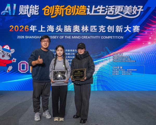 3月7日至8日,由中国上海头脑奥林匹克协会主办的“2026年上海头脑奥林匹克创新大赛暨第47届世界头脑奥林匹克选拔活动”在上海行健职业学院顺利举行。本次大赛以“AI赋能,创新创造让生活更美好”为主题,吸引了来自十余个省市的550多支队伍同台竞技,赛事旨在为青少年搭建创新实践平台,激发创造潜能,培养团队协作精神。我校两支代表队凭借卓越的创意表现与团队协作,在激烈角逐中脱颖而出,一举斩获一等奖1项、二等奖1项,并荣获赛事最能体现“OM精神”的特别奖项——富斯卡创造力奖,实现了我校在该项赛事中的历史性突破。