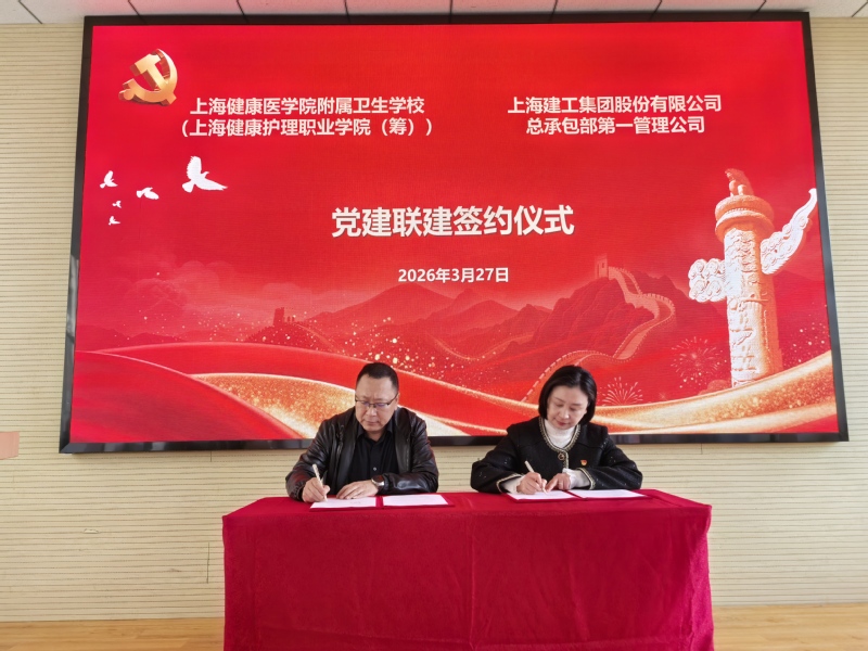 在党建联建签约环节,学校党总支书记钱艳,上海建工集团股份有限公司总承包部第一管理公司党总支书记黄淼分别代表学校与施工单位致辞,并共同签署《党建联建协议书》。