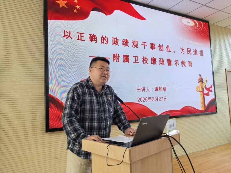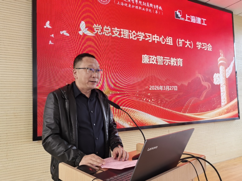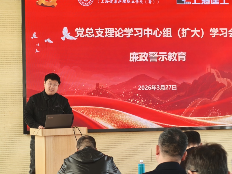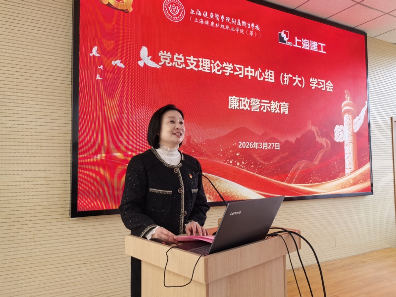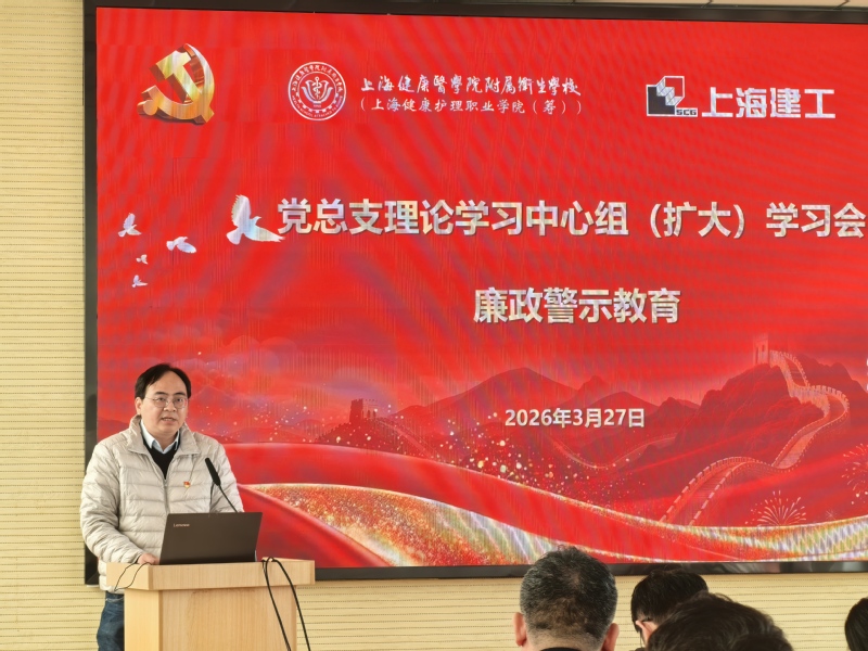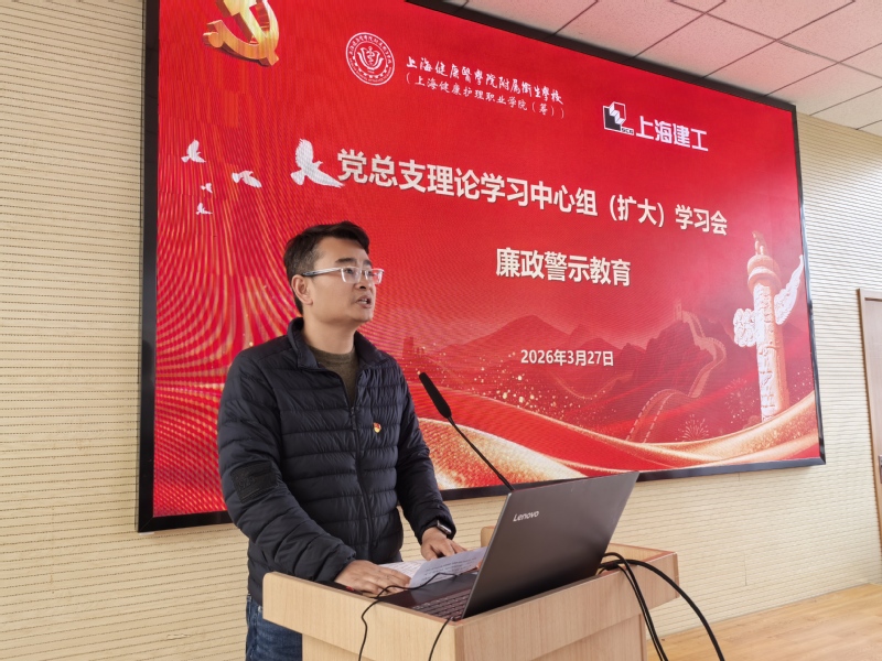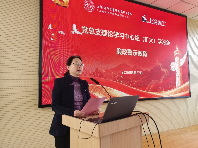 为深入贯彻落实“十五五”发展规划,紧扣职业教育高质量发展要求,筑牢新校区工程建设廉洁防线,扎实推进树立和践行正确政绩观学习教育走深走实,3月27日上午,学校举办党总支理论学习中心组(扩大)学习会,开展廉政警示教育、党建联建签约仪式暨“清风微讲堂”(2026年第1期),同步深化与医学院机关党总支基建处党支部的党建联建,以党建引领凝聚合力、共筑廉洁防线。上海健康医学院纪委副书记、纪委办公室主任、纪检监察室主任施奇,巡察办专职巡察员谭松珊,医学院机关党总支基建处党支部党员,上海建工集团股份有限公司领导,卫校全体校领导、中层干部、各党支部委员及重点岗位人员代表参加联组学习。学习会由党总支副书记、校长陈荣凤主持。