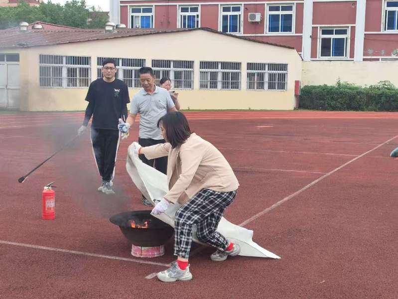 在理论培训结束后,全体人员移步至学校操场,参加灭火实战演练。现场模拟火点已然就绪,手套、灭火毯等专业消防装备一应俱全。总务科张志勇老师示范灭火毯的标准操作流程,细致拆解每个动作要领;寝室长、班主任代表与宿管人员轮番上场实践,在老师精准指导下掌握标准动作,安全扑灭火苗,学会了应急灭火技能。