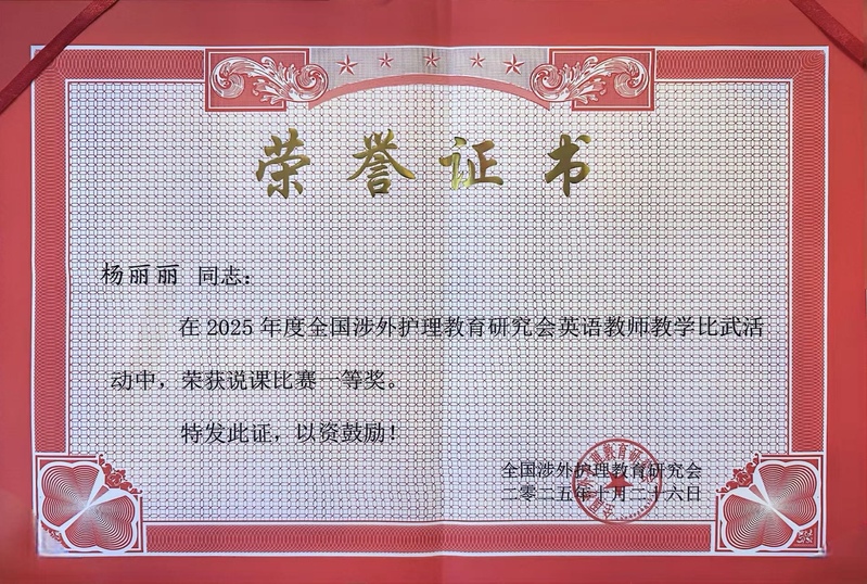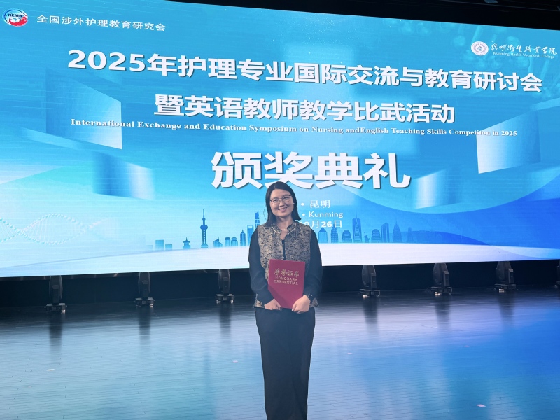 10月25日至26日,由全国涉外护理教育研究会主办的2025年护理专业国际交流与教育研讨会暨英语教师教学比武活动在昆明卫生职业学院圆满举办。本次活动汇聚全国各省市30余所中、高职院校及教育研究机构的专家学者与教师,共襄护理教育国际化交流盛事。我校首次选派教师参加教学比武,护理系教师杨丽丽凭借过硬实力脱颖而出,荣获一等奖,充分彰显了我校护理专业英语教师出色的教学水平与国际化育人素养。