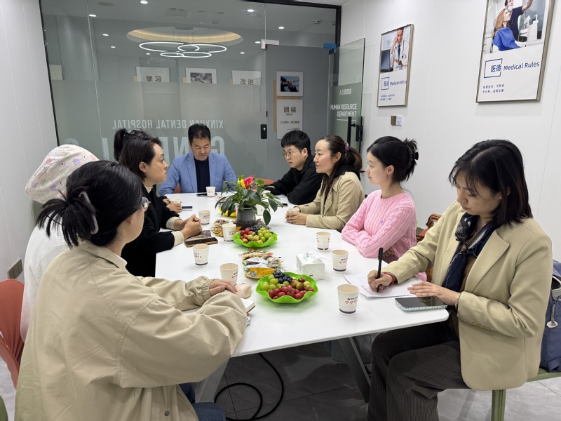 当天下午,在黄旭英院长与吴晓烽秘书长的陪同下,口腔专业教学团队来到馨园口腔医院参观交流。团队成员不仅了解到数字化诊疗流程与管理模式,更在口腔保健宣教室的功能布局、科普内容设计等方面收获了可借鉴的实践经验,为后续教学场景优化提供了新思路。在后续的研讨中,舒彩莲院长结合民营口腔机构的临床需求,强调口腔卫生保健专业人才培养既要夯实口腔预防、健康宣教等核心技能,更要强化医患沟通技巧培养,让学生成为“懂技术、善服务”的复合型人才。同时,黄旭英院长从临床一线的视角,深入剖析了口腔卫生保健专业的职业职责与行业发展前景。吴晓烽秘书长聚焦人才培养模式创新,提出院校双方可以建立常态化合作机制,通过资源共享、优势互补等方式提升人才培养质量,并承诺愿意为学校提供相关技能的培训支持,助力专业建设与发展。