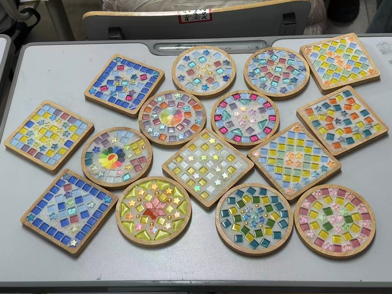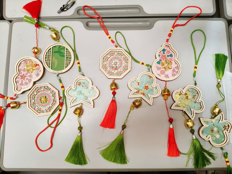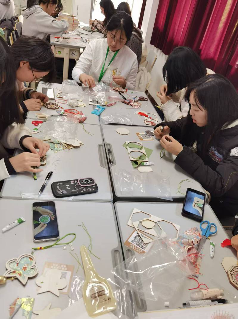 活动前期,心理健康教育中心结合学生心理需求精心打磨方案,设置六大特色体验项目:“冥想曼陀罗,创意具匠心”现场,同学们用马赛克石子在杯垫上拼贴图案,搭配出绚丽的色彩与纹理,舒缓压力;“风吹心动”环节里,大家用宋锦风铃套装创作专属风铃,微风拂过,铃声清脆,在传统工艺中寄托美好祝愿;“‘我’的面具”制作现场热闹非凡,同学们用中国颜料、折纸等材料装饰白皮面具,进行独特的自我表达;“平安如意”项目中,大家精心制作非遗宋锦葫芦挂件——寓意平安的小小葫芦;“平安祝福”环节充满温情,学生们沉浸在平安符刺绣中,一针一线绣出内心的期许;“流沙画中的自我悦纳”最受青睐,流动的沙粒在画盘中自由交织,引导同学们与内在自我深度联结,悦纳自我。