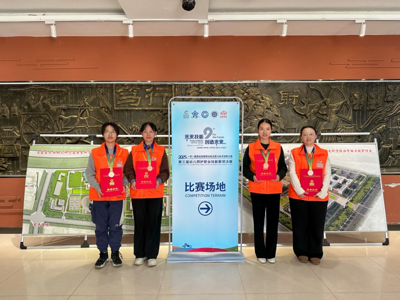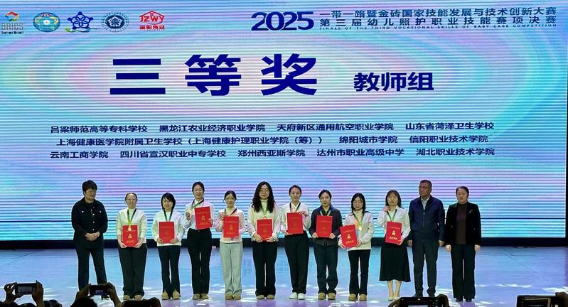 12月5日至9日,2025一带一路暨金砖国家技能发展与技术创新大赛第三届幼儿照护职业技能赛项决赛在内蒙古民族幼儿师范高等专科学校举行。我校首次组织教师参加该项赛事,护理系教师张伊倩、骆晓倩、顾珺怡、付迪与来自全国各地本科、高职、中职院校的41支教师队伍同台竞技,凭借扎实的专业知识和良好的综合素养,最终荣获三等奖(教师组),充分展现了学校在婴幼儿照护领域的教学积累与师资成长潜力。