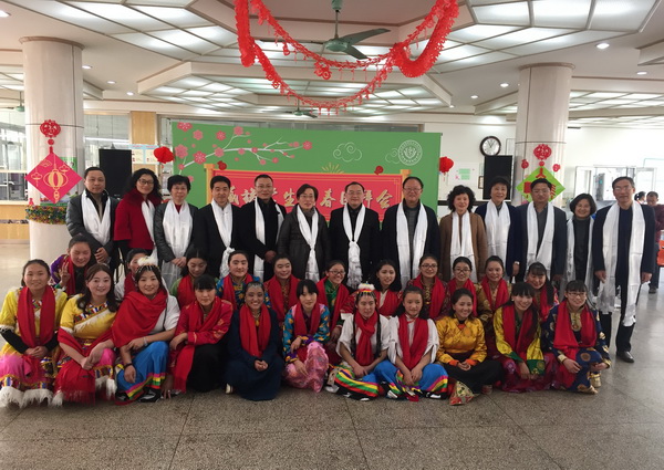 团拜会在黄钢校长的祝酒词中拉开帷幕,黄钢校长对我校七年来藏族班的顺利开办表示极大的欣慰,希望同学们像学长们一样,带着上海先进卫生理念和技术,学成回乡,报效家乡,服务乡亲。徐汇区委统战部向卫华副部长、凌云街道办事处王伟成主任向同学们致以新春的诚挚祝福,祝愿同学们在新的一年里身体健康、学习进步。随后,到会领导为同学们赠送了新春礼包和火红的围巾,藏族学生为到会的老师敬赠哈达,用家乡的风俗表达了自己的感激之情。整个团拜会穿插了同学们自排自演歌舞节目,极富民族特色的节目形式博得了现场阵阵掌声。最后,参会的老师和同学们跳起了的锅庄舞,整个会场陷入和欢乐的海洋。